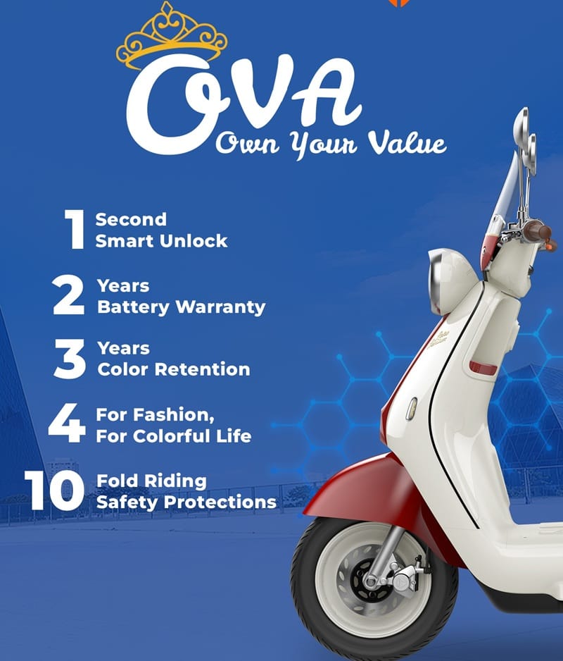 OVA hadir dengan desain elegan yang mendukung gaya hidup perempuan modern yang aktif. Alasannya berkat desain tiga detail utama yang ditawarkan, yakni desain retro, windshield besar, velg putih yang fashionable.